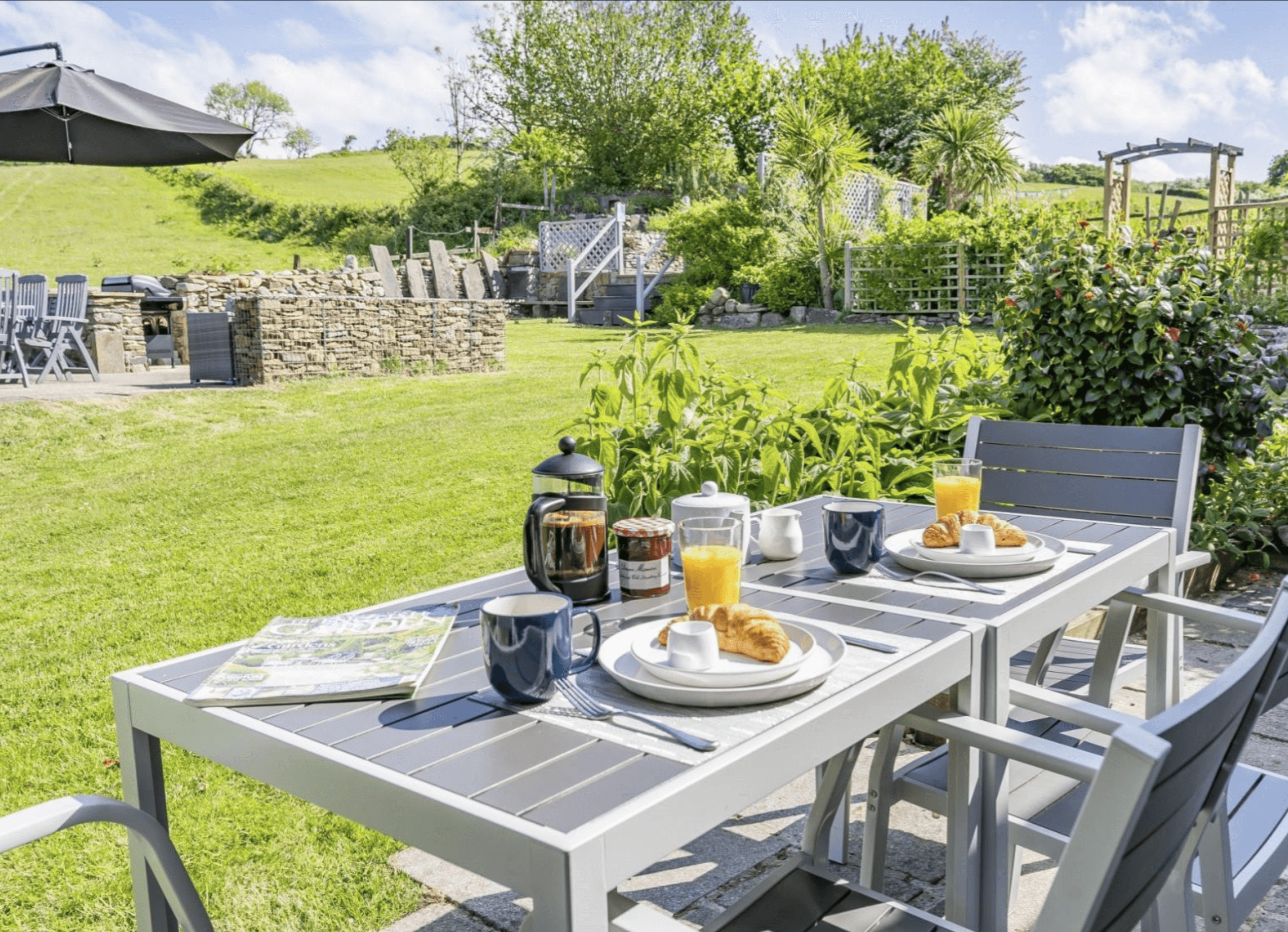 The sandstone patio area is large and offers great views of the rolling fields, woodland and the sea. It is surrounded by greenery and therefore feels sufficiently hidden away from the rest of the garden. Facing Northwest it’s a great spot to appreciate the sunset. There is also easy access to the larger barbecue and eating area, the utility room and the hot tub.